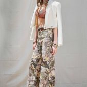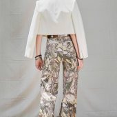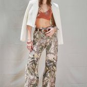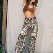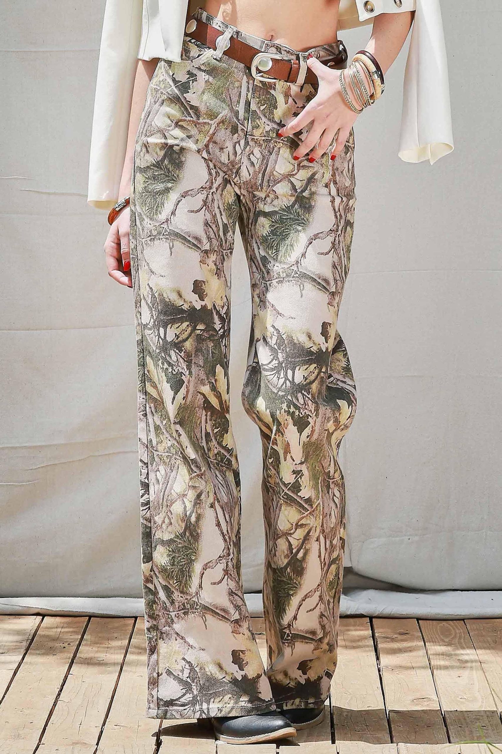 High-waisted, wide leg, camo print jeans featuring a nature-inspired forest pattern with branches and leaves in earthy tones of green, brown, and beige. Straight-leg cut with a structured fit through the waist and hips. Made from durable, mid-weight denim with a little stretch. Designed for styling versatility—pairs easily with crop tops, oversized blazers, or boots. Each pair is unique due to the print placement. Ideal for streetwear, outdoor-inspired looks, or adding contrast to minimalist outfits. Sizes run true; model wears size S.
