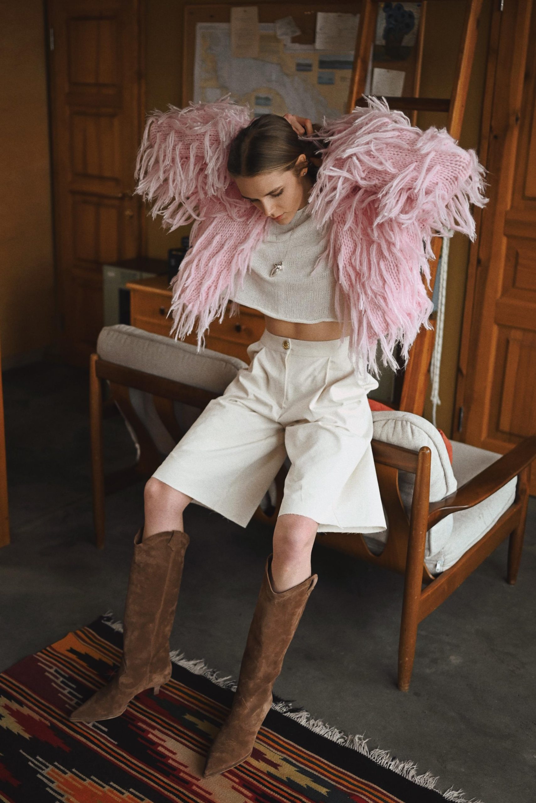 Pink alpaca and merino cardigan for women is available in soothing beige and pink hues. This fine material offers unparalleled softness and comfort, making it a joy to wear and care for. Handcrafted with meticulous care, each cardigan is crafted for warmth and durability. Available in one versatile size, it effortlessly enhances your silhouette with a playful and attractive look. Pair this versatile piece with pants, skirts, long sleeves, t-shirts, and our handmade accessories for a stylish ensemble that transitions seamlessly from day to night.